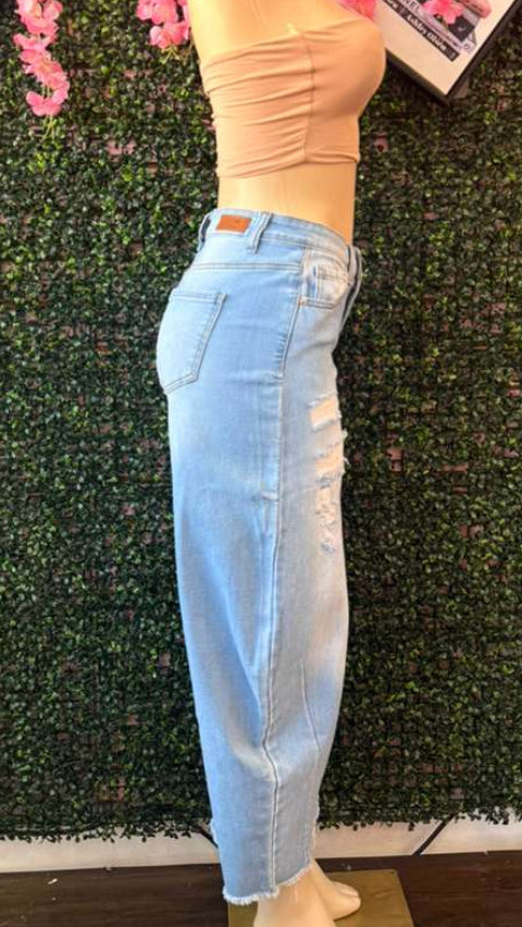 Shredded Light-Wash Barrel Leg Jeans