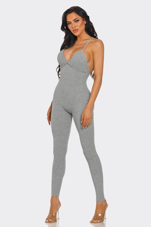 Sold outGREY KNIT SPAGHETTI STRAP JUMPSUIT