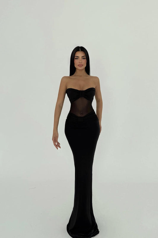 BLACK STRAPLESS MAXI DRESS WITH MESH DETAIL