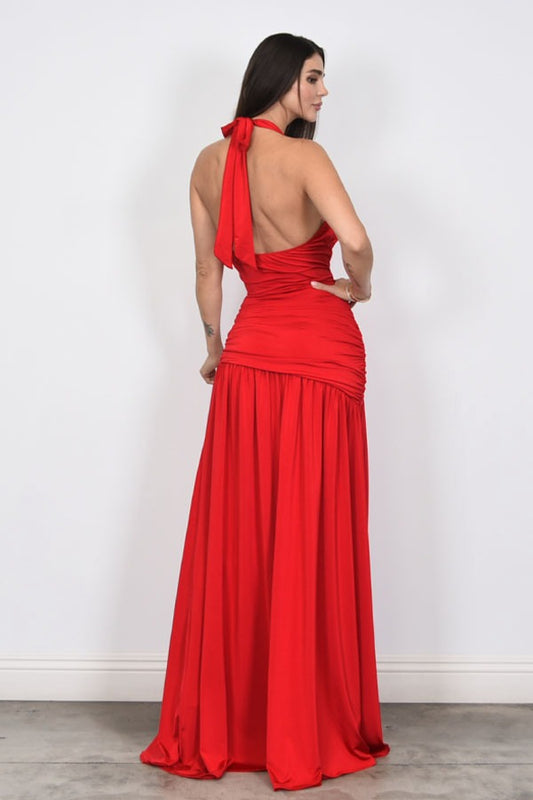 STRAPLESS MAXI DRESS WITH LEG CUTOUT AND FRONT BUCKLE ACCENTS