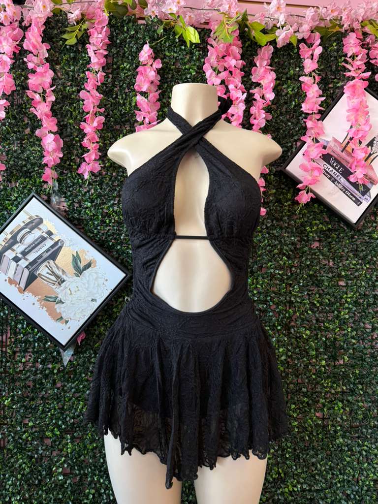 The outfit is a black lace mini-dress, orskort-style one-piece with a halter neckline.