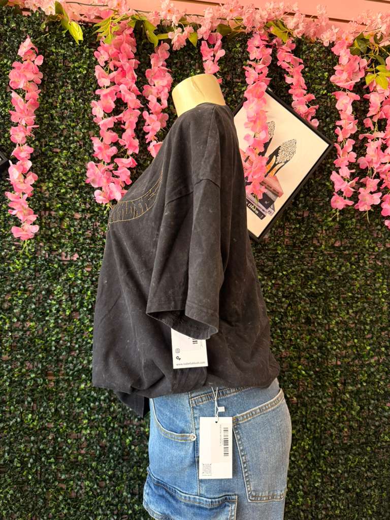 The shirt is an oversized boyfriend-fit tee made from a charcoal grey acid-wash cotton. The mineral wash gives it a faded, distressed texture that looks authentically vintage.The front is dominated by a large, minimalist longhorn skull graphic