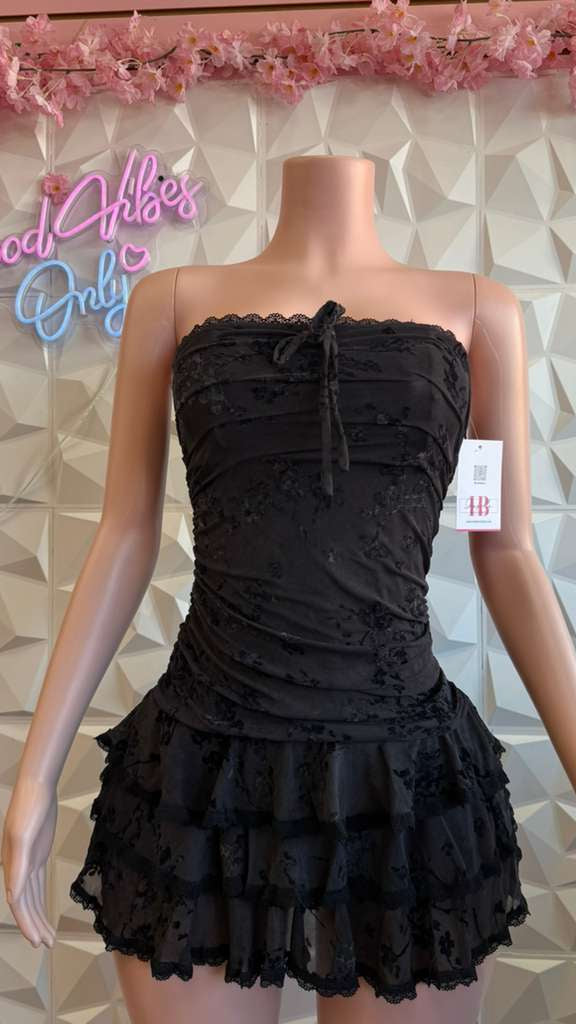 This is a strapless, black mini dress with a very feminine, slightly edgy aesthetic. The dress is form-fitting through the bust and waist, creating a flattering, cinched look, and flares out into a voluminous, ruffled skirt.