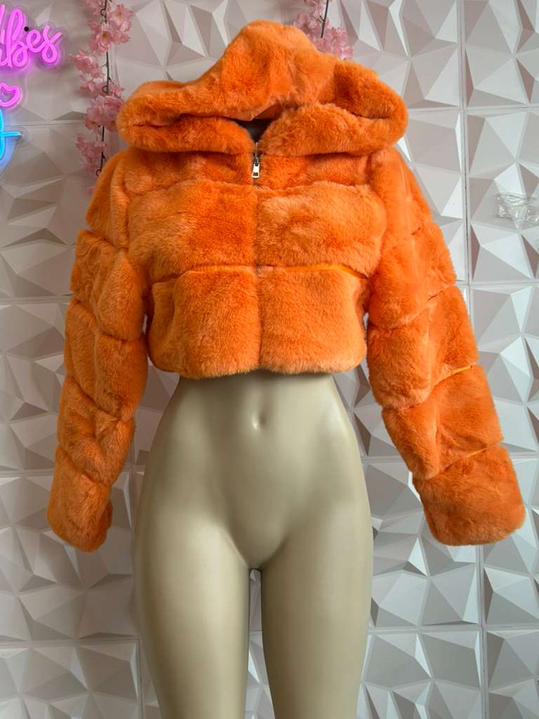 It's a cropped jacket, cut short to expose the midriff or waistline It is made of faux fur, giving it a plush, soft, and voluminous texture. The material is styled in horizontal panels or segments across the body and sleeves, which adds dimension and structure.