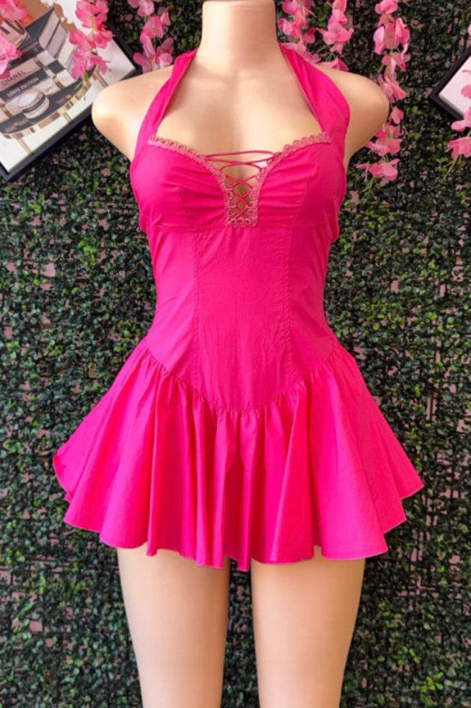 HOT PINK HALTER MINI DRESS