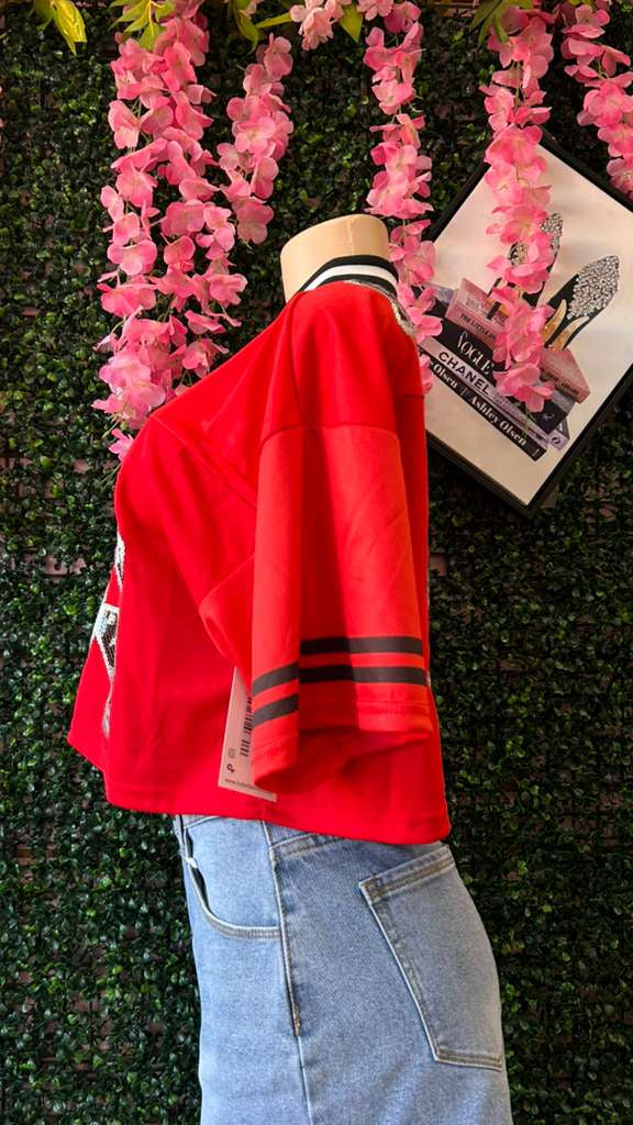 This is a red, short-sleeved jersey with a trendy cropped silhouette. It features a classic V-neckline with a black and white ribbed sporty collar, mirrored by double black stripes on the sleeves.Two large, stylized dollar signs ($) rendered in black and silver sequins.