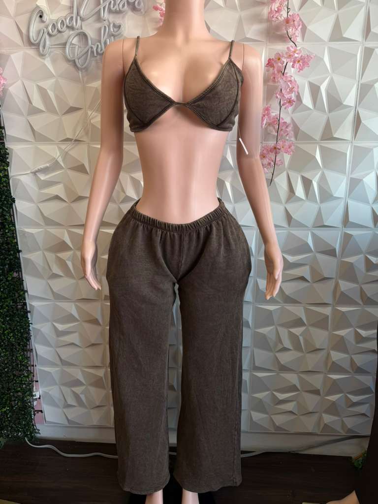 Paired with a matching brown triangle bralette that has thin spaghetti straps. This creates a very minimal, relaxed loungewear set perfect for casual comfort or a warm day. Also paired with a sheer, long-sleeved, dark brown bodysuit that has a crew or scooped neckline. Underneath the sheer fabric.
