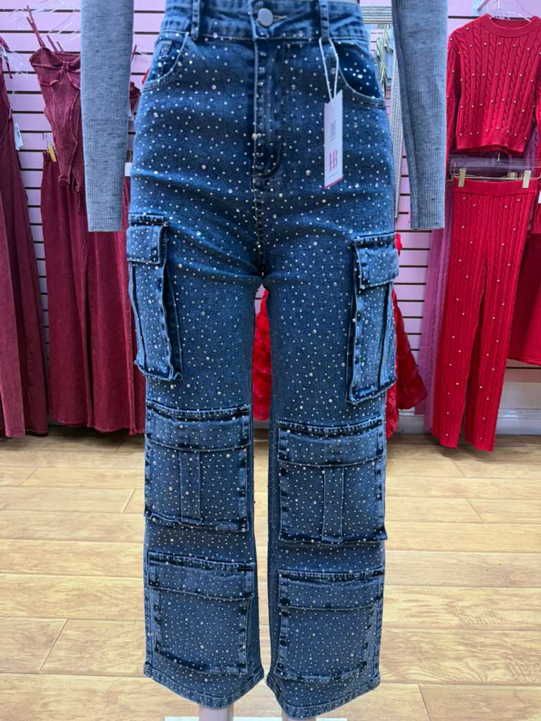 The entire garment is heavily adorned with small, evenly scattered rhinestones or studs, creating a sparkling, "stardust" effect across the denim. This transforms the typically casual or utilitarian cargo style into a more glamorous, eye-catching piece.