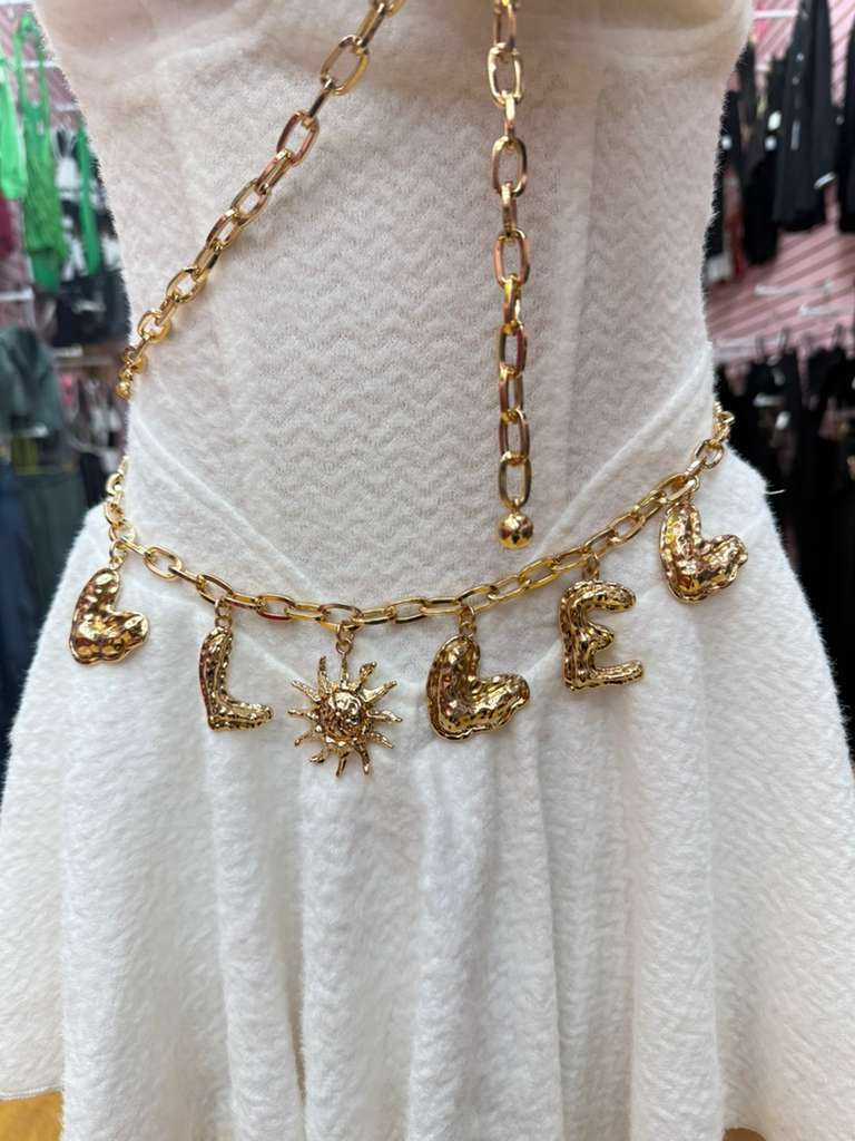 This is a delicate, custom-style charm chain belt featuring personalized letter and object charms. The belt itself is a single-strand gold-tone curb link chain of medium weight. The charms spell out a word, LOVE.