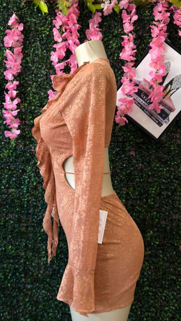 It features a dramatic, plunging V-neckline that is accentuated by cascading, oversized lace frills. These ruffles frame the chest and extend down the center, adding volume and a whimsical touch.