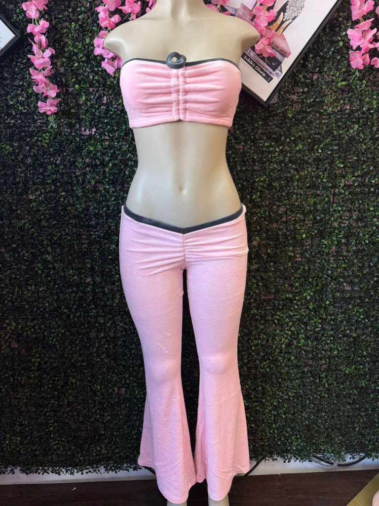 This is a two-piece coordinated set made from a soft, stretchable fabric, featuring a tube top and matching flared pants.