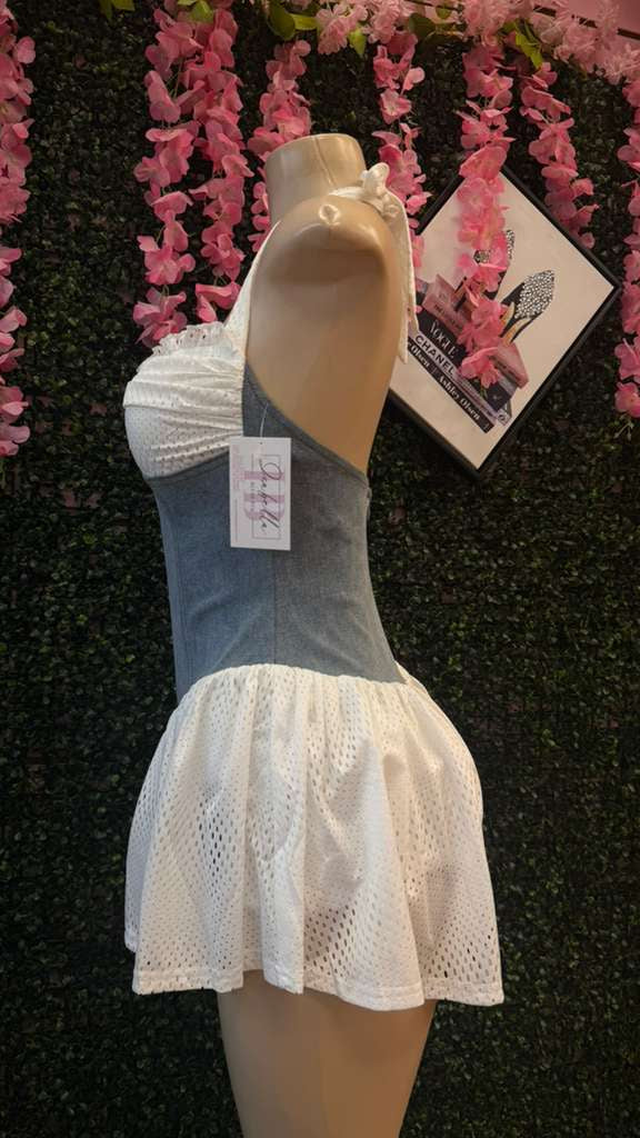 The centerpiece is a denim-style corset in a light-to-medium wash. It features a traditional pointed "V" waistline and a functional hook-and-eye front closure, providing a structured, cinched-in look. The top and skirt sections are made from a white eyelet or perforated mesh fabric, which adds a delicate, airy contrast to the heavy denim.
