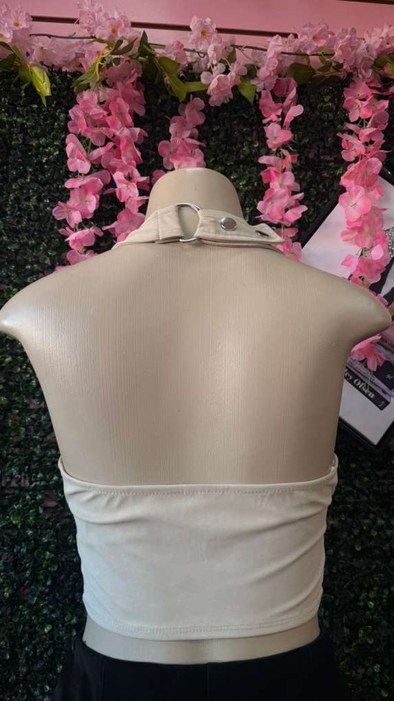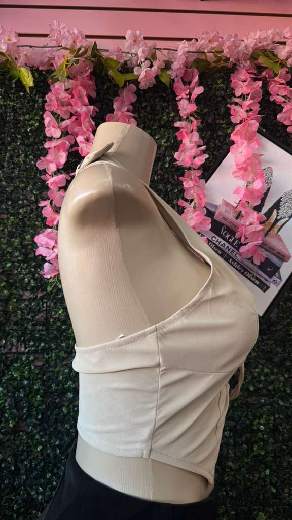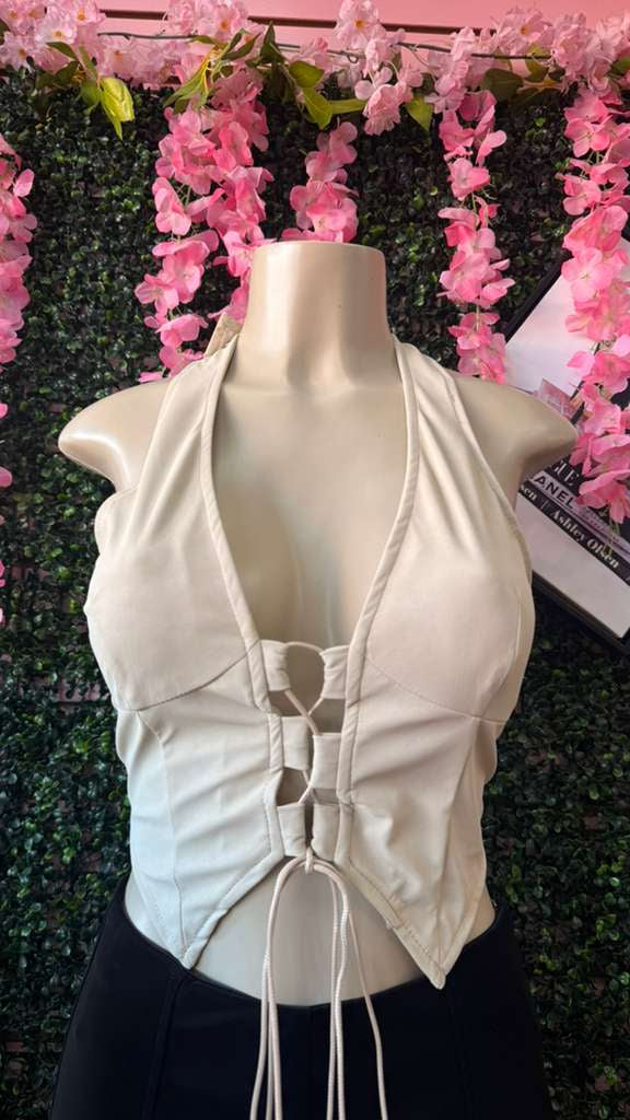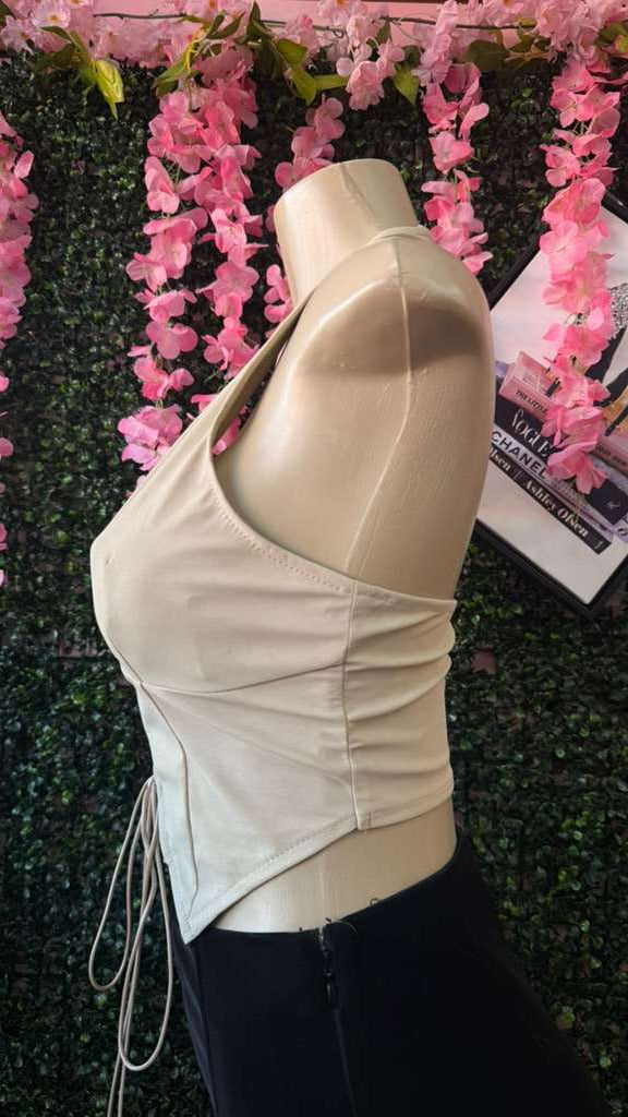This top is a modern, structured take on the classic halter, blending corset-style elements with a clean, minimalist aesthetic .It features a deep V-neckline with a halter-style strap that wraps around the neck.