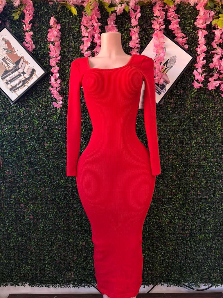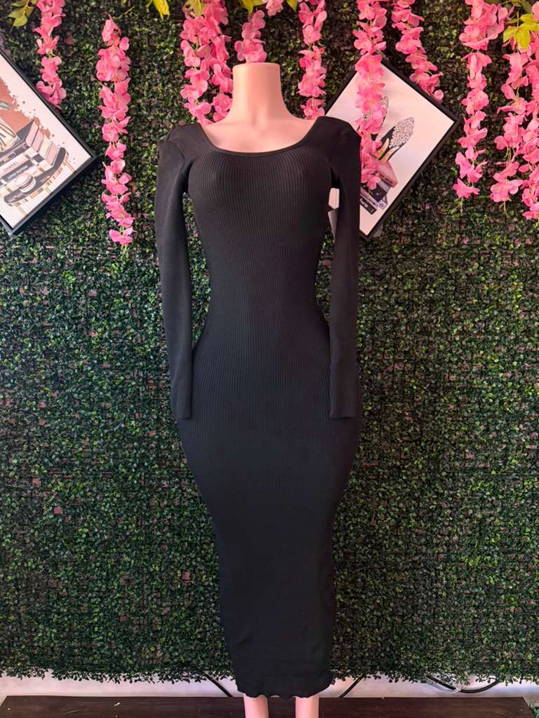 It features an incredibly bodycon (body-conscious) fit, designed to contour and hug the figure from the neckline down to the hem.Long sleeves, tight to the arm.A square neckline, which is stylish and modest in the front, offering a clean, structured look.