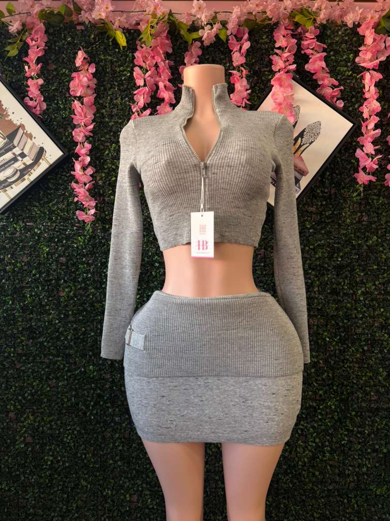 A two-piece matching set consisting of a long-sleeve crop top and a mini skirt. Features a zipper closure down the front, allowing the wearer to adjust the plunge of the neckline.