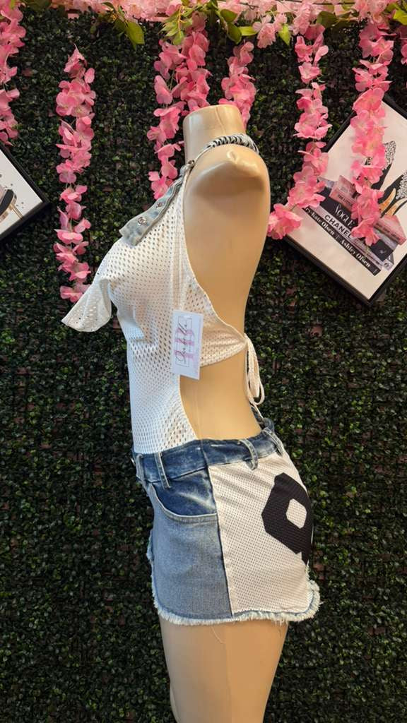 This is a white mesh halter bodysuit with a unique, draped cowl neckline. The defining feature is the denim halter strap, which appears to be repurposed from a waistband, complete with belt loops and a button, adding a "distressed" or "reconstructed" element to the piece.