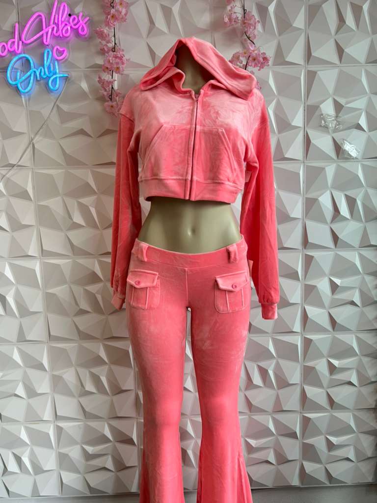 This fabric and color combo is strongly reminiscent of the early 2000s "tracksuit" trend.The pants are mid-rise ,with a fitted thigh that flares out dramatically at the bottom, making them a bell-bottom style.